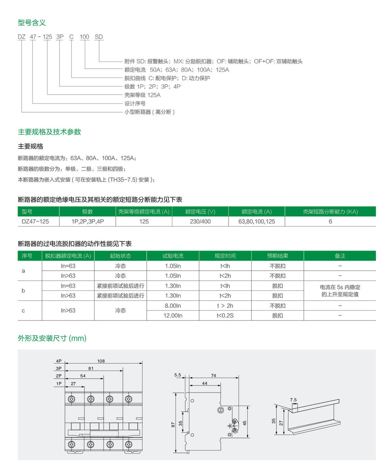 DZ47-125高分断小型断路器具有外型美观小巧、重量轻,性能优良可靠,分断能力高,脱扣迅速,主要用于交流50Hz/60Hz、电流值125A电力线路过载、短路保护,同时也可以使用在正常情况下不频繁地通断电器装置及电机和照明线路。